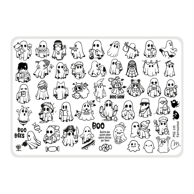 Placa acrílica para estampar uñas, marca Colombiana Nail Art Magenta con hermosas figuras de halloween, fantasmas tiernos.