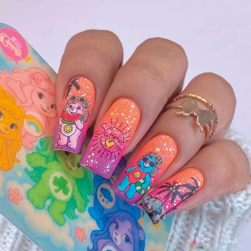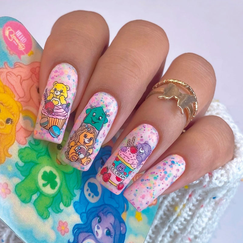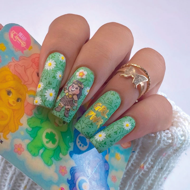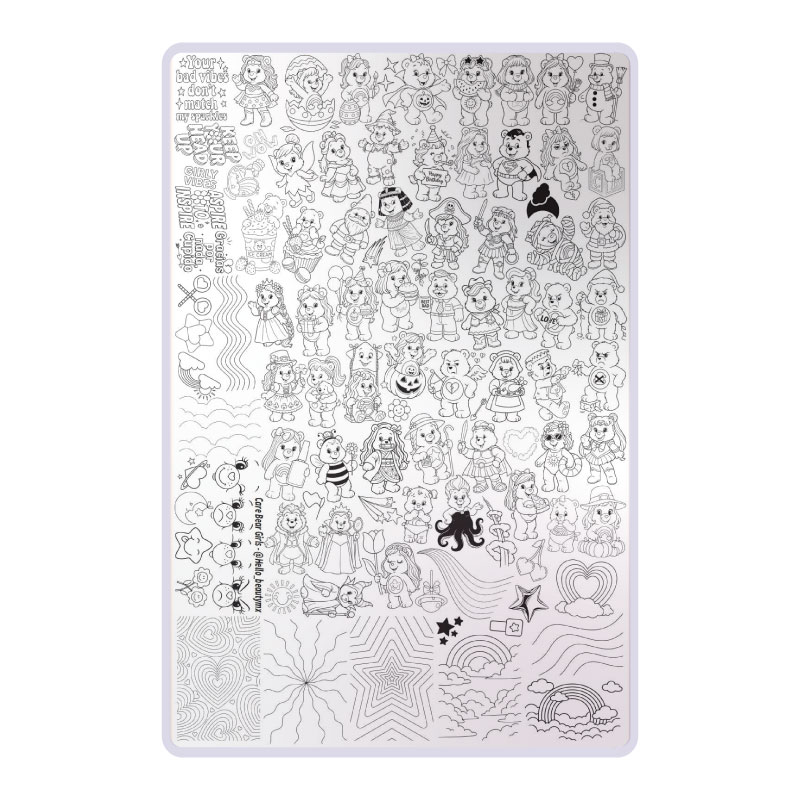 Placa metálica para estampar uñas, marca Mexicana Hello Beauty con hermosas figuras de Care Bear, pero en versión ositas coquetas.