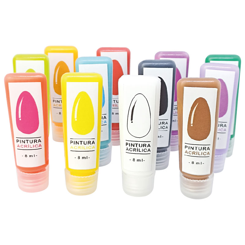 Set de doce (12) pinturas acrílicas para decoración de uñas en recipiente especial que facilita la manipulación y dosificación, disminuyendo el desperdicio. Incluye tonos neón y tonos metalizados.