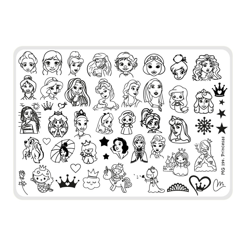 Placa acrílica para estampar uñas, marca Colombiana Nail Art Magenta con hermosas figuras de Disney princesas.